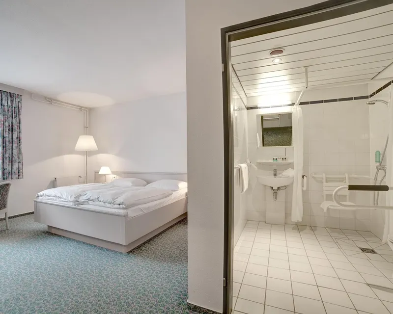 Unser Standard behindertengerechtes Zimmer verfügt über folgende Ausstattung: Twin-Bett (auch als Einzelnutzung), Schreibtisch, Flatscreen TV, Garderobe mit Kofferablage, Telefon und kostenfreies WLAN. Das komfortable Badezimmer hat eine Dusche inklusive Haltegriffen und Duschstuhl, ein WC mit Haltegriffen, ein gesenktes Waschbecken und einen Föhn.